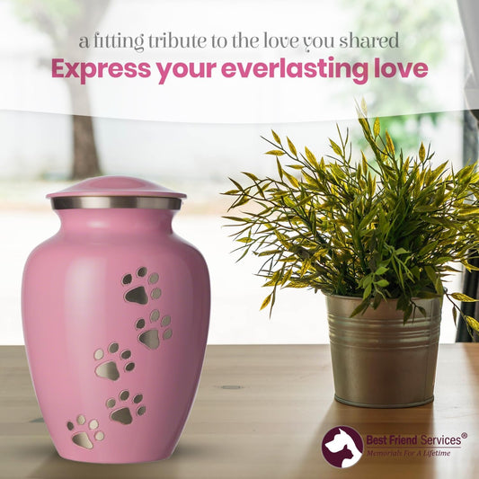 Ottillie Paws Legacy Series Pet Urn for Dogs, Handmade Aluminum Memorial Cremation Urn (Medium - Pets up to 65 Lbs, Ardent Pink, Vertical Pewter Paws)